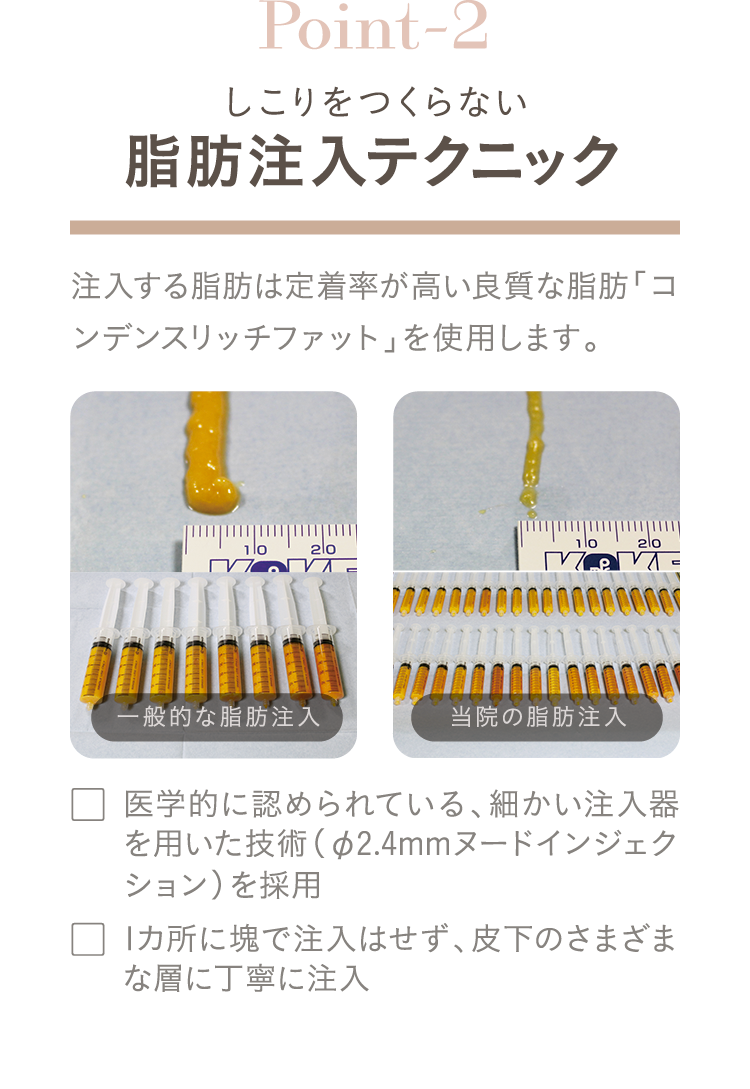 直径2.4mm未満の麺状で細かく脂肪を注入する技術です。大きな塊で注入すると、血流から酸素や栄養が供給されずに壊死します。これを避けるために細かく何層にもわたって脂肪を注入します。