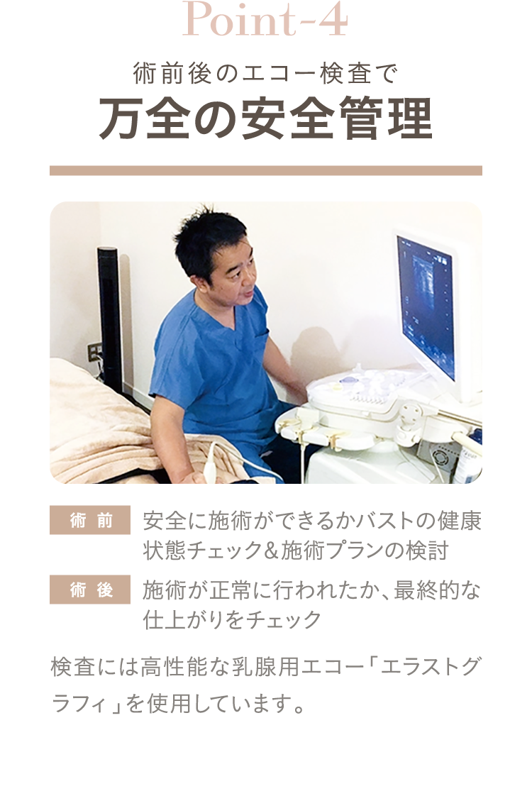 バストの内部をチェックする超音波検査です。術前は脂肪の注入量や挿入するバッグの大きさの目安、しこりなどの異常の確認を目的に実施します。術後は仕上がりのチェックのために行います。