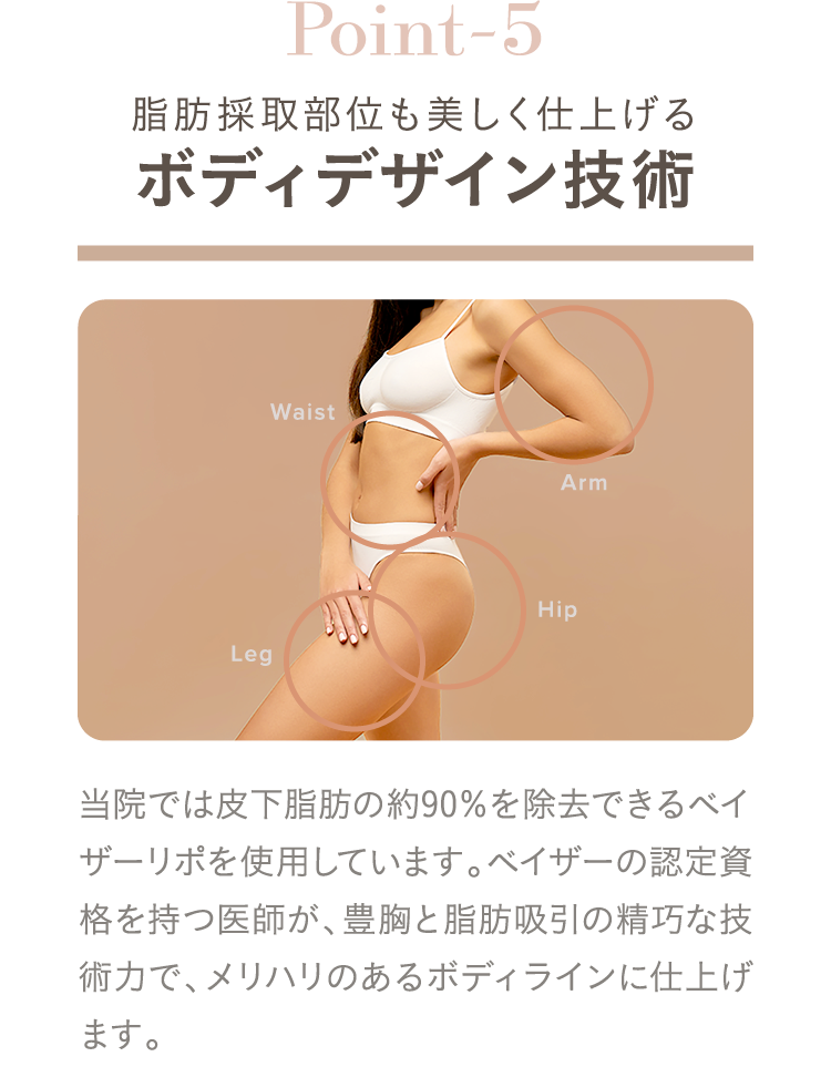 ベイザー脂肪吸引では、線維組織に付着した脂肪を超音波の振動でバラバラにした後、脂肪細胞だけを吸い出します。このため周辺組織へのダメージが少なく、ダウンタイムの軽減が期待できます。